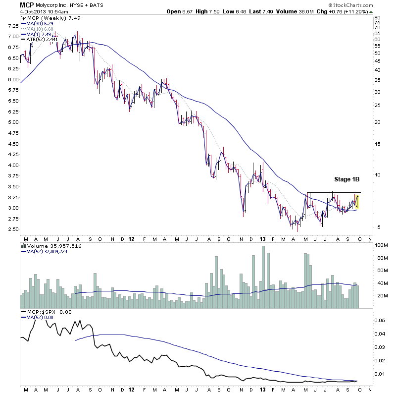 I've highlighted MCP a number of times on the thread over the last few months, and bought into it myself in early August. It continues to trade in Stage 1B and has had a strong week. Relative performance is breaking above the zero line, but volume is still only average currently, but the 50 day MA and 200 day MA are today at the same level, so could crossover finally.