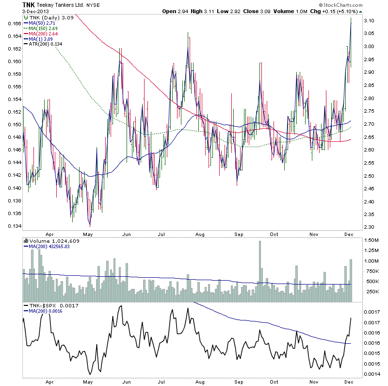 TNK is attempting a Stage 2A breakout against the falling market of the last few days. Volume is close to the weekly average after only two days, so it has the potential to meet the two times the weekly average volume requirement. Relative performance is attempting to break above the zero line for the first time in a number of years, but there is still some near term resistance in the upper $3 range also, which could provide a challenge. Attached is the charts.