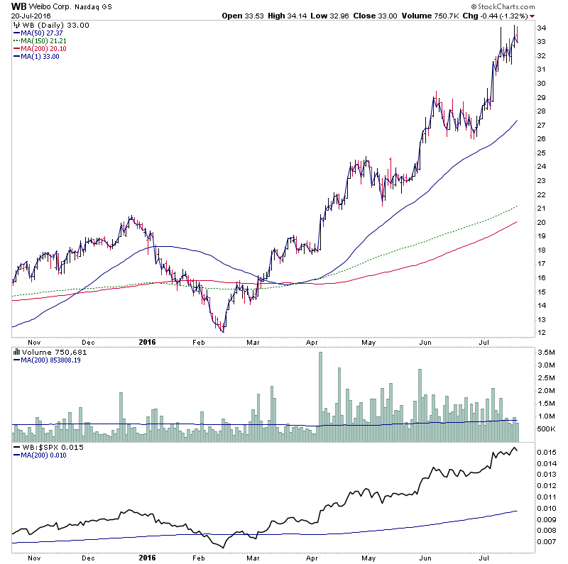 When I talk about looking for the new leaders in a bull market. WB is the kind of price action that I am talking about imo. Think this one is very early in it's Stage 2 advance, and will be looking for a suitable pullback for a potential entry.