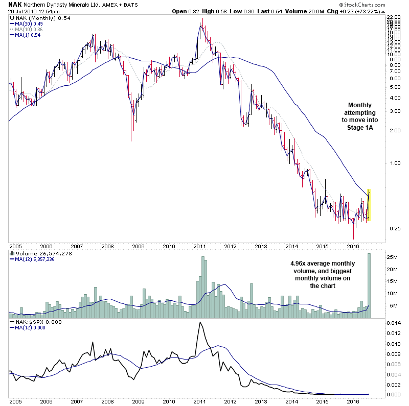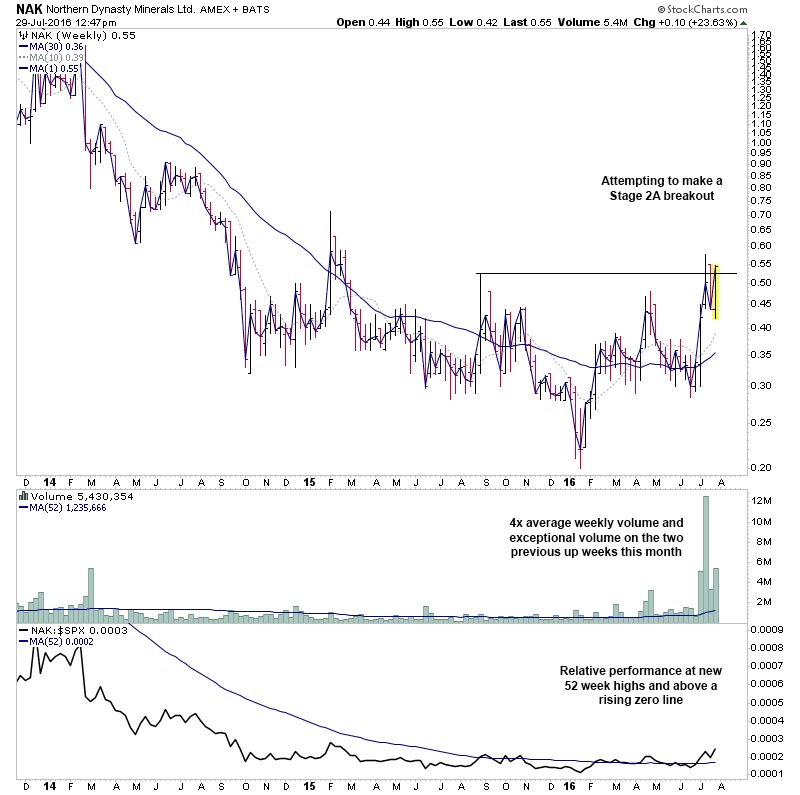 RE: US Stocks - Watchlist and DiscussionNAK - I highlighted this one earlier in the month here: http://stageanalysis.net/forum/showthrea...4#pid10324 on it's first Stage 2A breakout attempt. But it didn't complete the breakout, after a weak close that week and is now trying again on more than 4x average weekly volume.