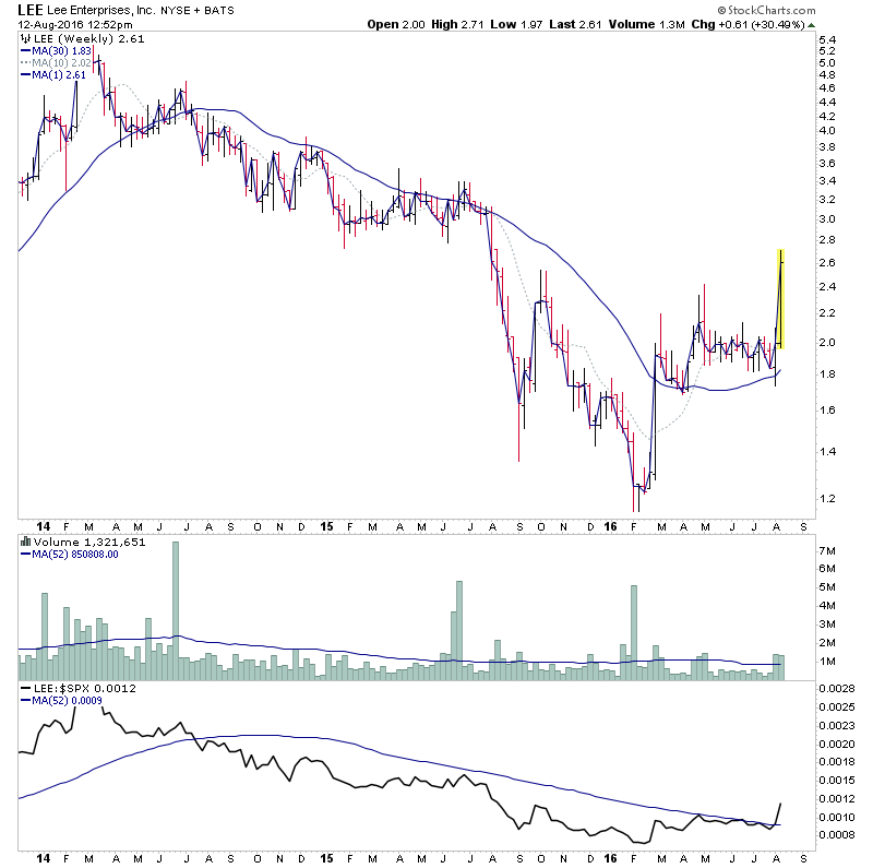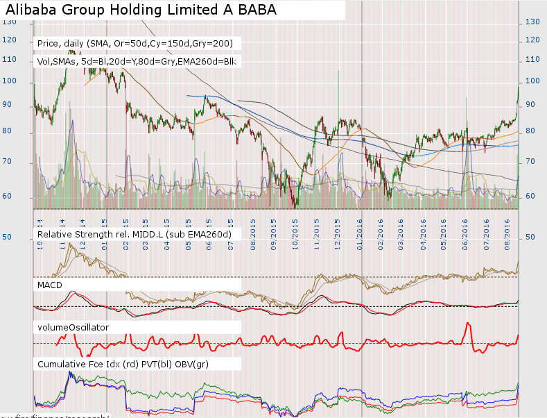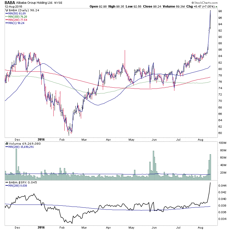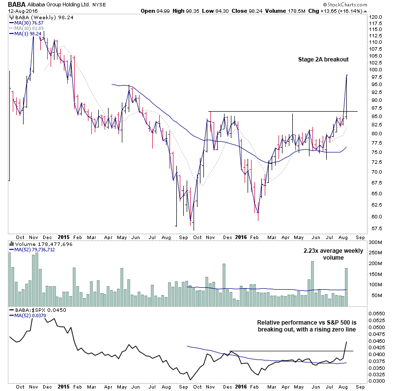I highlighted BABA earlier in the week on the Stage 2A breakout day http://stageanalysis.net/forum/showthrea...2#pid10522, and it's followed through to close the week at it's high on more than 2x average weekly volume and strong relative performance. So a good quality breakout.