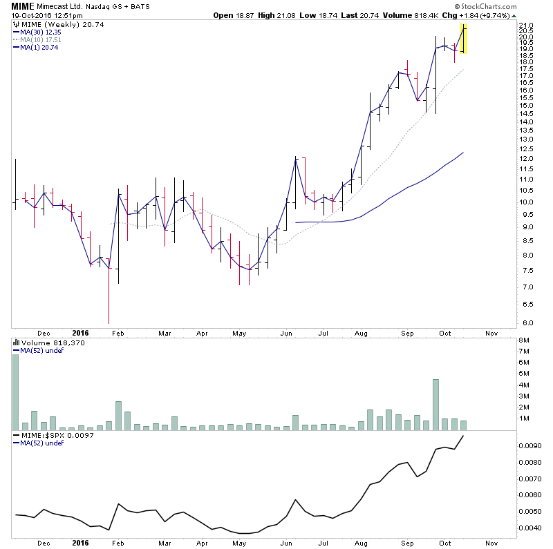 ESNC - Single digit midget in the early part of Stage 2 still, but a steady climber on strong relative volume since the breakout. So one to watch for a potential pullback/consolidation entry point to form imo.