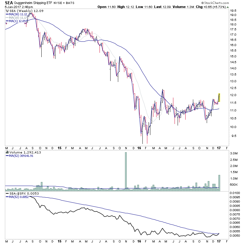 I'm going to try and spend some time going through the industry performance lists this weekend, as being the start of the new year I like to look for early themes and especially sector recovery plays. I haven't had time to do the full 100+ sectors, but from a brief look through some of the top performing sectors this week I've noticed Marine Transportation has a number of stocks attempting to complete decent sized Stage 1 bases, although the Stage 4 declines were very heavy in most, and so they will still likely have a lot of resistance and so could still be too early. But the sector is interesting me, and so I'm going to do some more research as i'm looking for a sector with potential, and as you can see from the SEA ETF that covers the sector, it's moving inot Stage 1B as a sector, and I need to drill down into the individual stocks some more to look for the leaders.