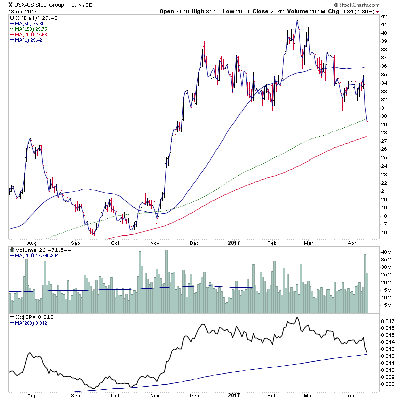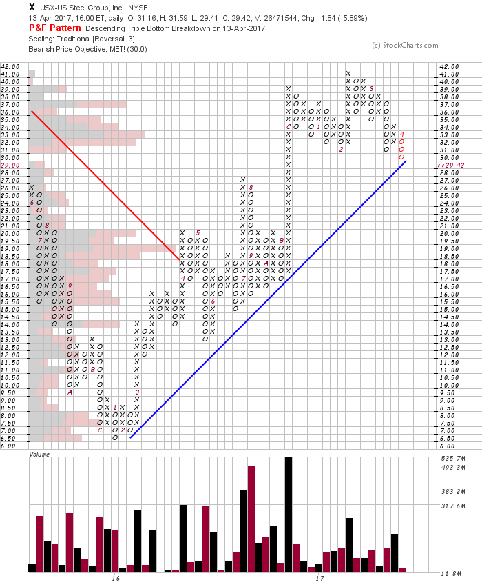 Fate does not always let you fix the tuition fee. She delivers the educational wallop and presents her own bill - Reminiscences of a Stock Operator. RE: US Stocks - Watchlist and DiscussionUS Steel Corporation broke down its neckline yesterday ! RE: US Stocks - Watchlist and Discussion(2017-04-14, 10:23 AM)ephemere Wrote: US Steel Corporation broke down its neckline yesterday ! I'm not sure I agree that this one is going to collapse into a Stage 4 phase, as this weeks close only puts it into early Stage 3A imo, and there are still a number of factors supporting it. For example the still rising 30 week simple MA, it's still a fair way above support, the relative performance versus the S&P 500 is still above it's flattening zero line. And on the daily chart it's still above a rising 200 day MA, which is often a major buying point for institutional buyers, and hence a source of support. And on the point and figure chart it has yet to break the major up trend line, although it's close to it. And the S&P 400 Mid Caps Index that it's part of is still in Stage 2, although in a pullback phase. Plus it's relative strength in the S&P 400 as measured by stockcharts SCTR(Mid) calculation is 93.7/100, and hence one of strongest stocks in the index. Also another way to look at it is if you flipped the chart vertically and determined the Stage. Which if you did like the attached below would only be the first move into Stage 1A. So I'm not saying that it won't collapse like you've suggested, as early Stage 3 often has a very sharp decline, but just simply that it's a long way from Stage 4 yet and hence a down target would be more conservative currently imo.