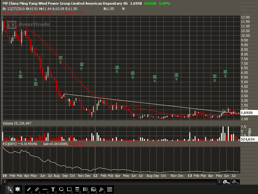 (2013-07-25, 04:45 PM)gbarbs Wrote: Interested in MY. Good entry? I poked around alternative energy, wind, solar, etc and this seems to be a sector having some breakouts out of stage 1. RS is a concern. Deep in negative territory but it increased slightly (almost level). But volume is so strong that I am willing to give it a chance because of that and the sector looks like it is breaking out.