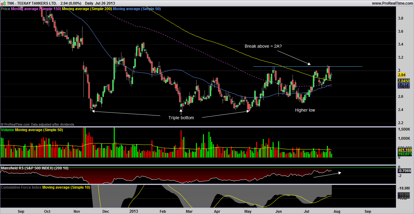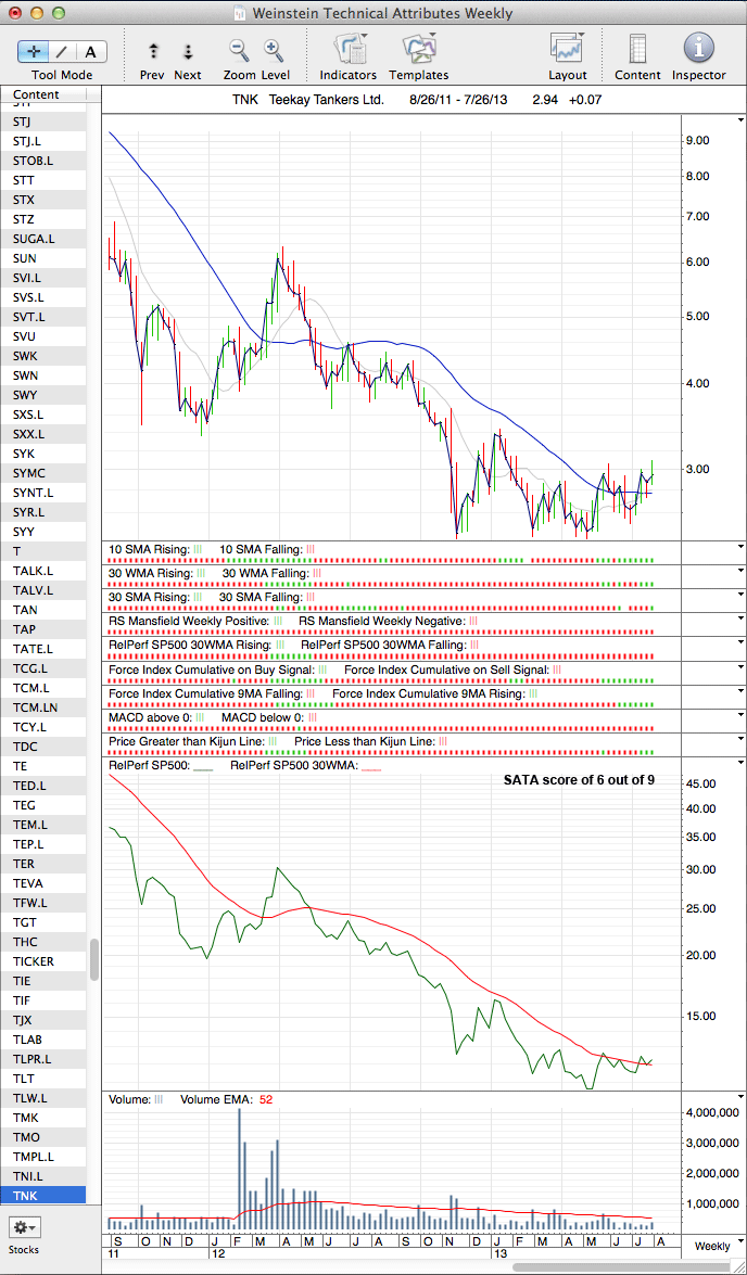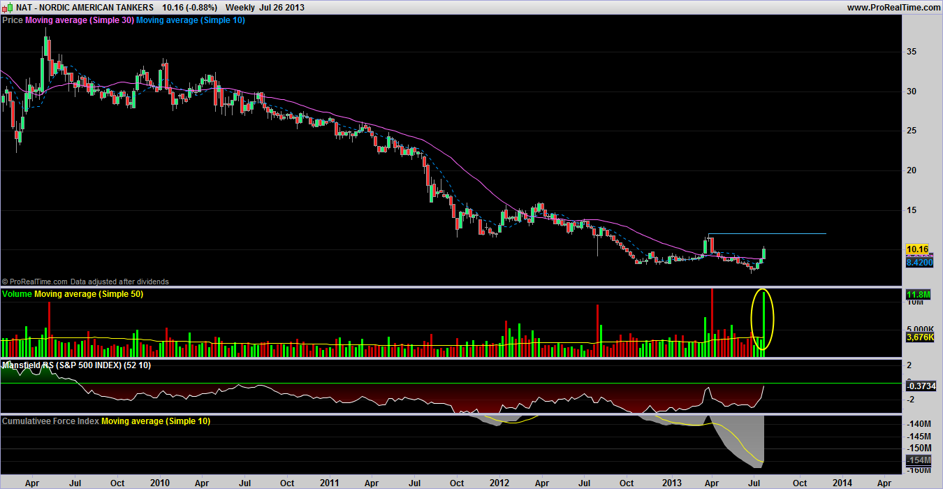 RE: Watchlist - Investor methodAnother industry on my investor watch list is the shipping industry. I've used a chart of SEA the Guggenheim shipping ETF to represent the industry in the absence of a dedicated index. If I'm missing something kindly let me know. As you can see I have interpreted the industry to be in a stage 2A and whilst recent price action is no pretty and it is struggling to find momentum I would best describe it as a base on base. The higher low and it finding support at the 200 dma arguable three times is encouraging. Anyway as we are interested at playing the strongest stocks in the industry I thought I would bring Teekay Tankers (TNK) and Nordic American (NAT] to your attention as a potential investor buy. These stocks are also currently paying a dividend of 4.07% and 6.3% respectively which is nice bit of icing on the cake assuming these can at least be maintained. I used to listen to Chris Waltzec on Gold Seek radio once a upon a time and I remember his stock picks often included shipping stocks which always paid good dividends so it seems like this is an industry standard. First TNK, has had about an eight month basing period despite the thirty week MA only recently flattening out. If it had not been for the basing period I would have categorized it as been in a stage 1A but if it is on the verge of breaking out then it surely must be in a stage 1B? What do you say Isa? Next up NAT, I tend to think that it's a bit early in stage 1 to consider this one but the volume that has come in is leading me to think this one is going to be another one that does not look back from here. Comments welcome. RE: Watchlist - Investor method(2013-07-27, 09:58 PM)goodtyneguy Wrote: First TNK, has had about an eight month basing period despite the thirty week MA only recently flattening out. If it had not been for the basing period I would have categorized it as been in a stage 1A but if it is on the verge of breaking out then it surely must be in a stage 1B? What do you say Isa? I've attached my charts, and included the weekly Stage Analysis Technical Attributes chart also, which shows that it moved up one point this week to a 6 out of 9, which is consistent with scores for Stage 1A to Stage 1B from the examples threads. But Stage 1B stocks tended to be more towards the 8 end of the scale, and so that suggests from the technical attributes that it's turning higher earlier than average, and hence why you said that you would have initially categorized it in Stage 1A above. Looking at the price action it's been in a multi year Stage 4 decline, and last years prolonged basing period and eventual collapse now gives it some quite strong near term resistance to deal with. Relative performance is improving, but the volume has been very weak lately. Also I noticed the angle of the 200 day MA is quite steep still. So my personal opinion would be that although it's near the Stage 2A breakout point and hence a Stage 1B currently. That it's still quite early in it's recovery and that the January high and 2011 lows around the 3.5 zone might give some resistance. If you do trade it, the stop loss distance is quite good for an investor position at around 4.5x ATR(200).