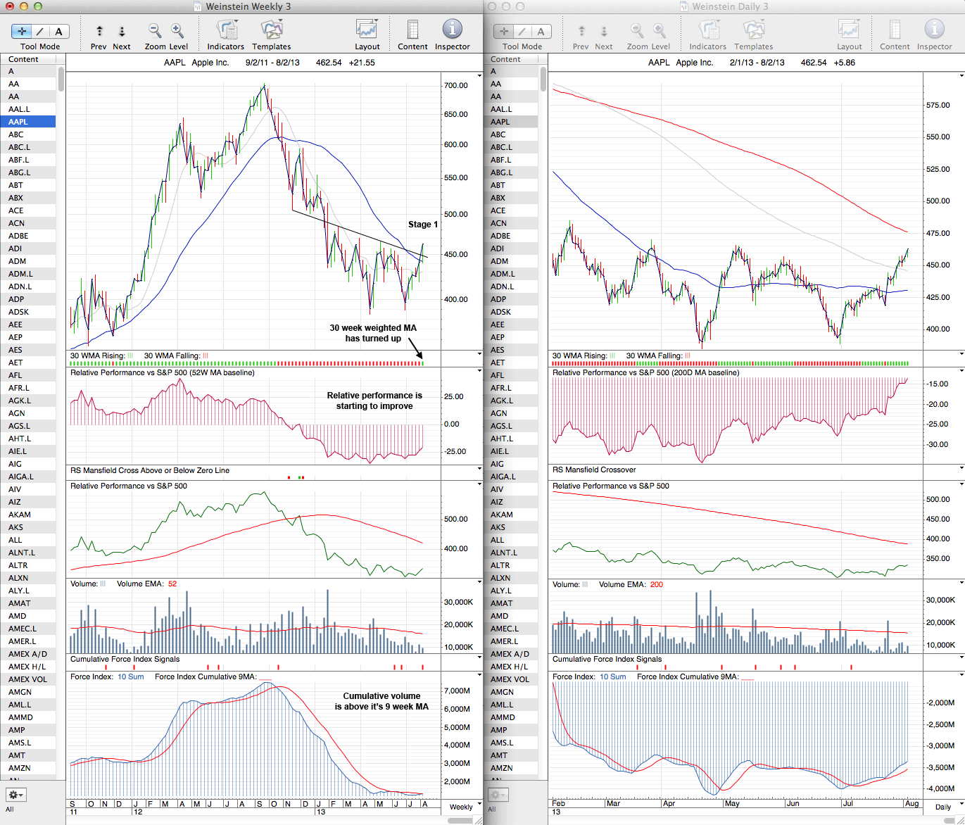 The technicals are improving for AAPL, with relative performance finally beginning to pick up a little and volume, although looking quite anemic, has actually moved above it's moving average on the cumulative volume and also attached is the traditional scale point and figure chart which shows that the price has moved above the long term down trend line.
