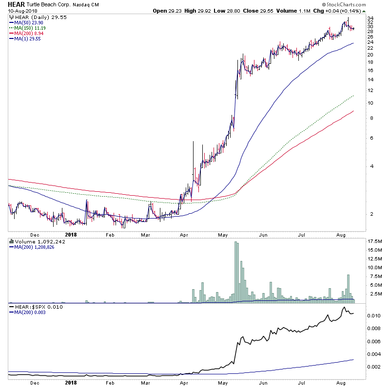 HEAR has had an extreme volume surge for three weeks that has taken it through it's near term resistance zone with a multi digit move. So it's one to watch for what happens on it's first significant pullback once this initial Stage 2A high volume thrust has ended. Watch for a contraction in volume when the pullback occurs, as that will guide as to whether it's suitable or not to consider.