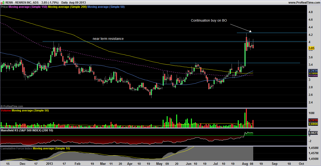 i wish i could say i got into RENN on the breakout but not so. I think i intially noticed the chart when scanning top 10 market movers. i'll run through those typically to find breakouts and then watch for pullbacks (always check the sector/group though). recently, i have stayed away from some good looking charts because stops were too far away (which happens when you miss the breakout). then they just keep going higher and higher. so, i decided to just buy a little so that if the stock price does drop back a large %, its still a small % against my portfolio. and at that point can add a normal size position at a safer level. if it does continue rising, then i get to take part and rewarded for finding it.