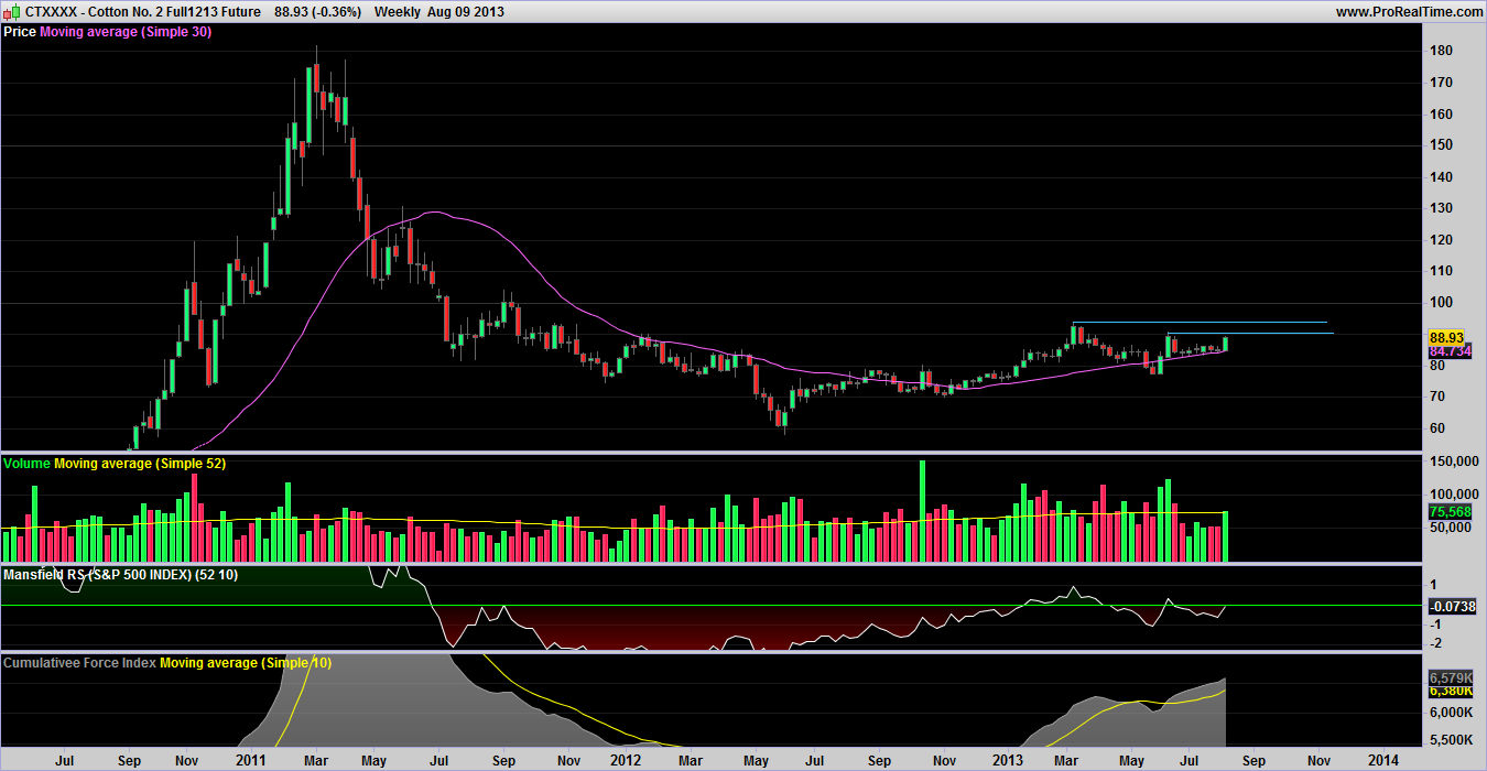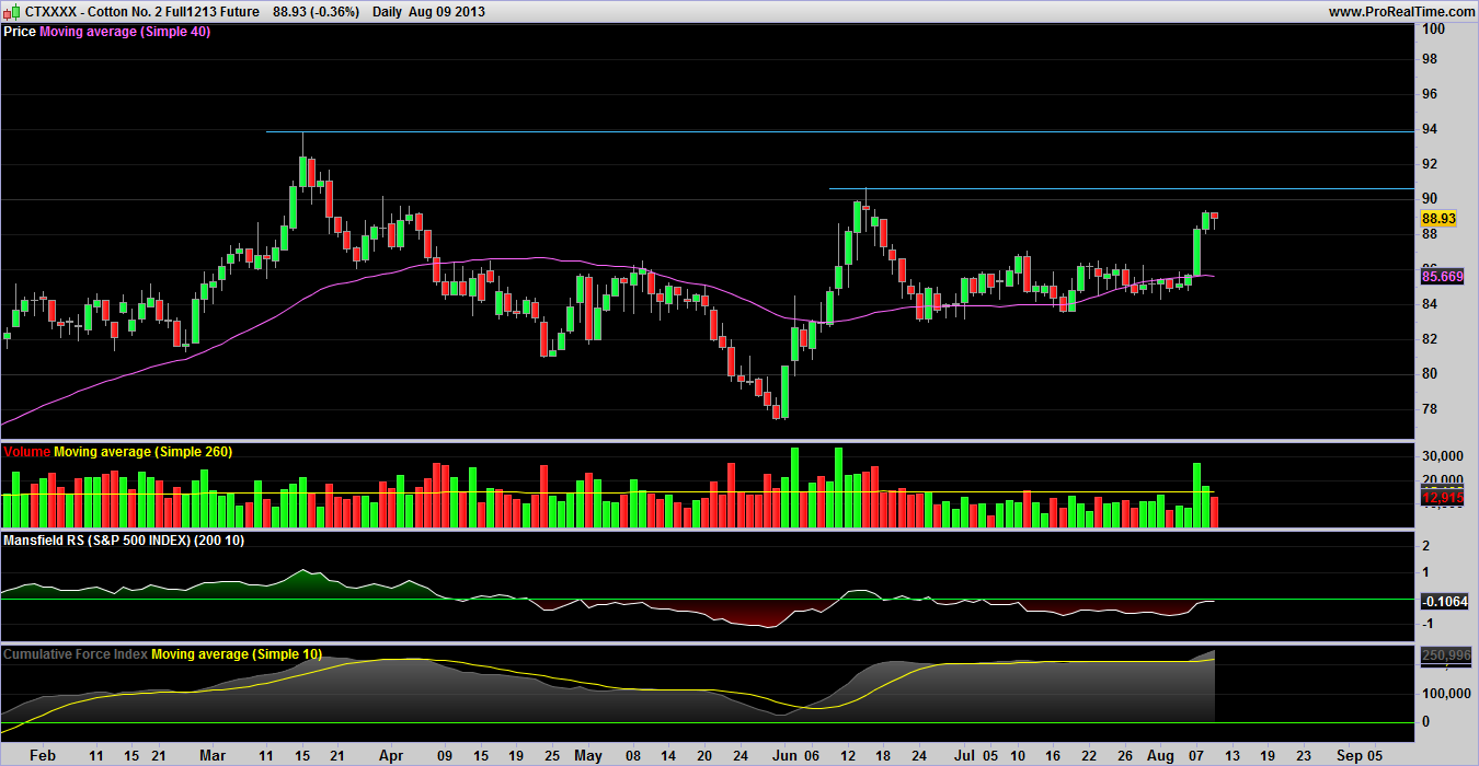 Cotton looks poised to break out into stage 2A with just a little near term resistance to overcome. Worth watching the price action to see if it sets up a pivot low below the break out level for a good R2R ratio for a trader play to the near term resistance. An investor play with a stop below the 40 dma would have a low risk of approx. 2.45 times the ATR200.