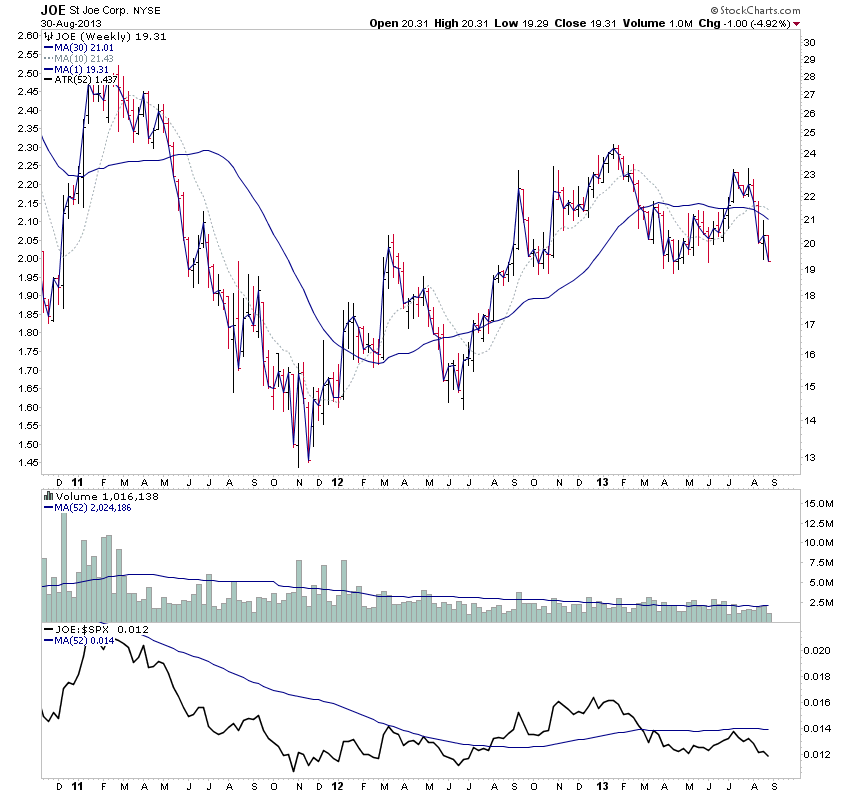 JOE (St Joe) in the Real Estate Development sector ($DJUSEH) is another potential Stage 4A for the watchlist. Attached is the weekly chart and the relative performance chart versus it's major and sub-sectors.