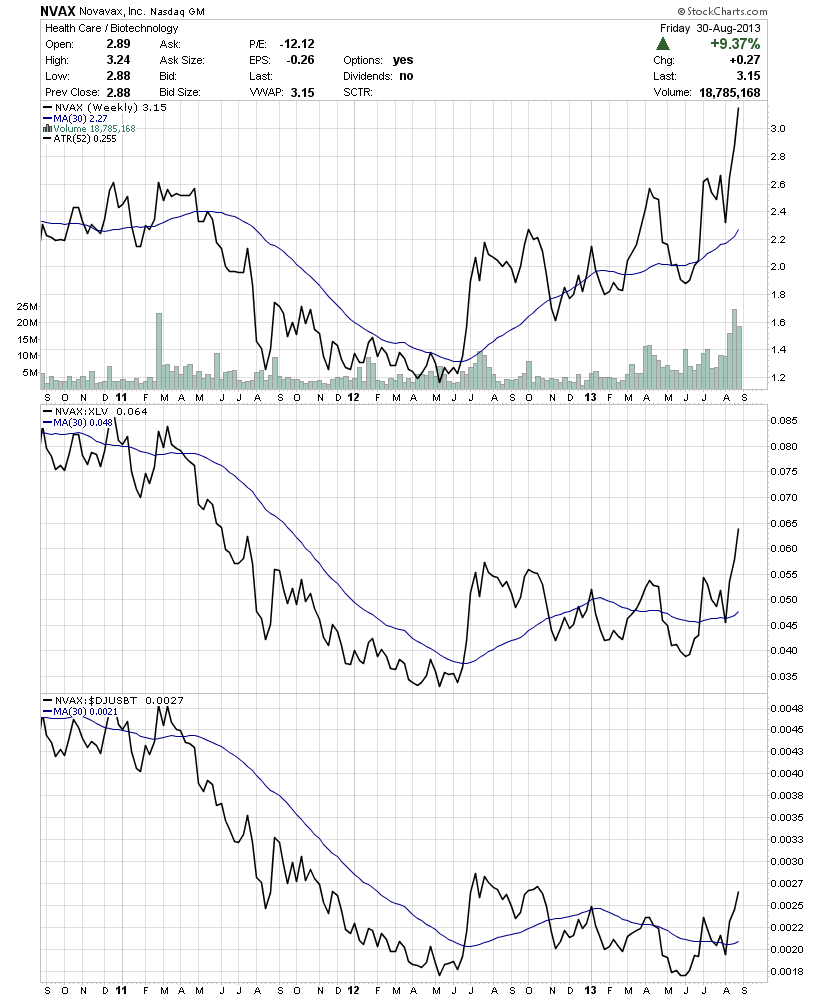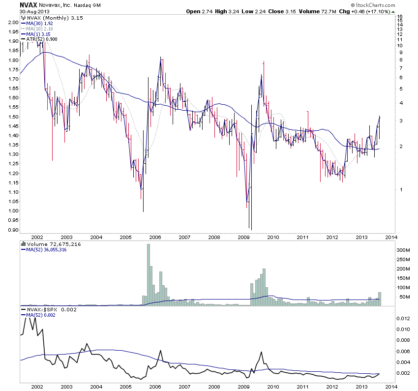 NVAX continued higher last week on decent volume and strong relative performance versus the S&P 500 to close the month at two year highs. But if you scale out onto the long term monthly charts you can see that it was the heaviest monthly volume in four years, and coincided with a monthly Stage 2A breakout.