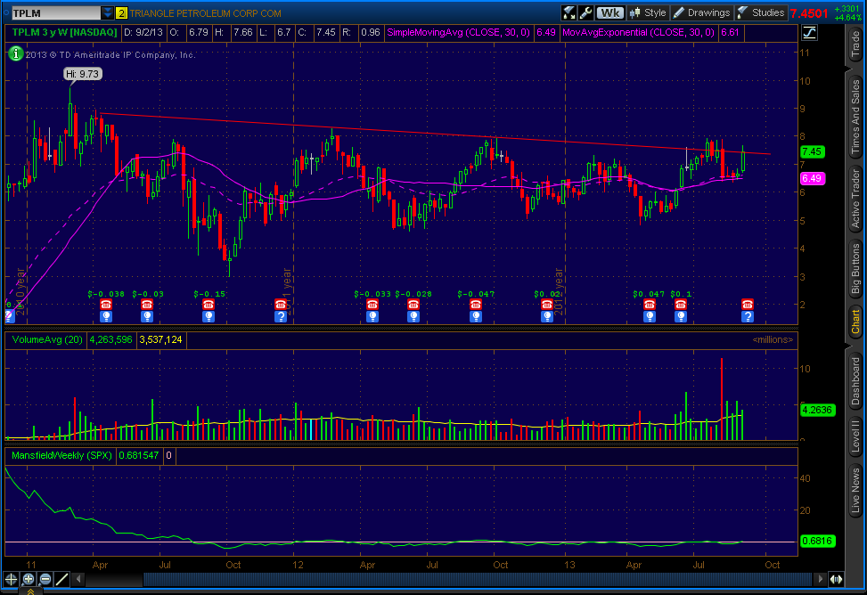 One other I was looking at....has wide swings in the base, MA has turned up, and volume has increased. Although the volume actually decreased when it broke through that trendline giving me some concern - I am not sure how to interpret the volume other than it has been higher than average recently.