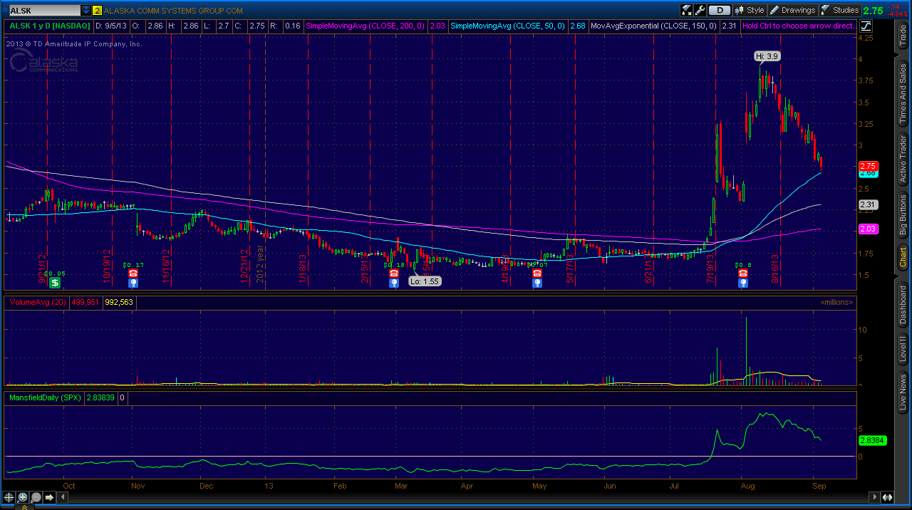 (2013-09-05, 05:01 PM)gbarbs Wrote: ALSK pulling back. It touched its 50 dma today. Not safe enough for me yet, but I am watching it. Just thinking it might bounce off the 50 day here and continue up. We'll see.