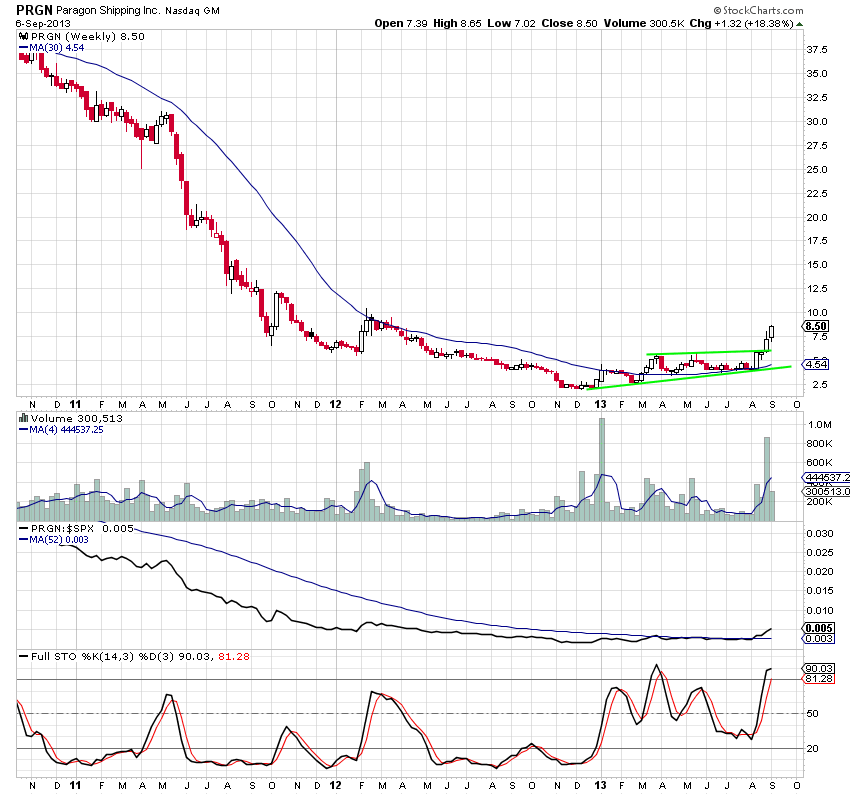 My current favorite of those I found is PRGN as it rose about 40% since its breakout about 2 weeks ago on a great volume spike. PRGN was in a Stage 1 base for about a year prior to this. It’s above the MA, the MA is starting to rise, the relative performance is rising and just popped over the zero line, and finally cleared its overhead resistance. The current P&F price target is $17.75. EGLE and GNK also have a lot of potential.