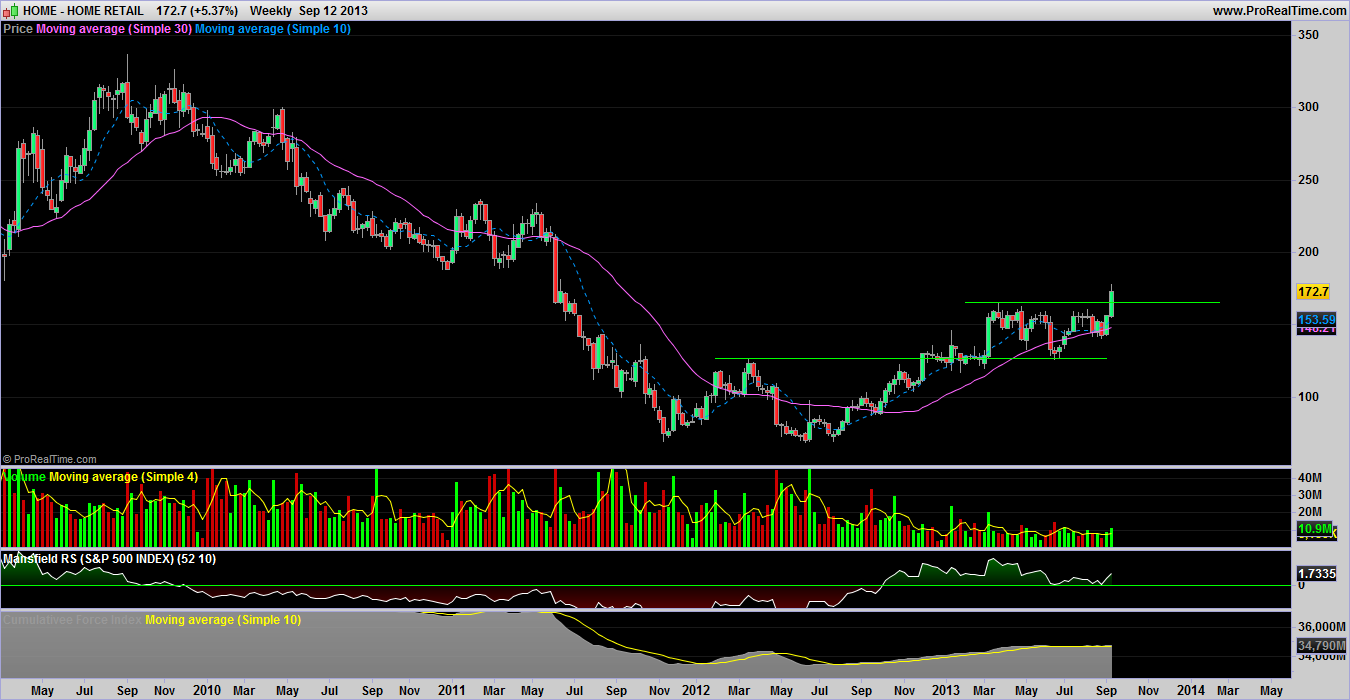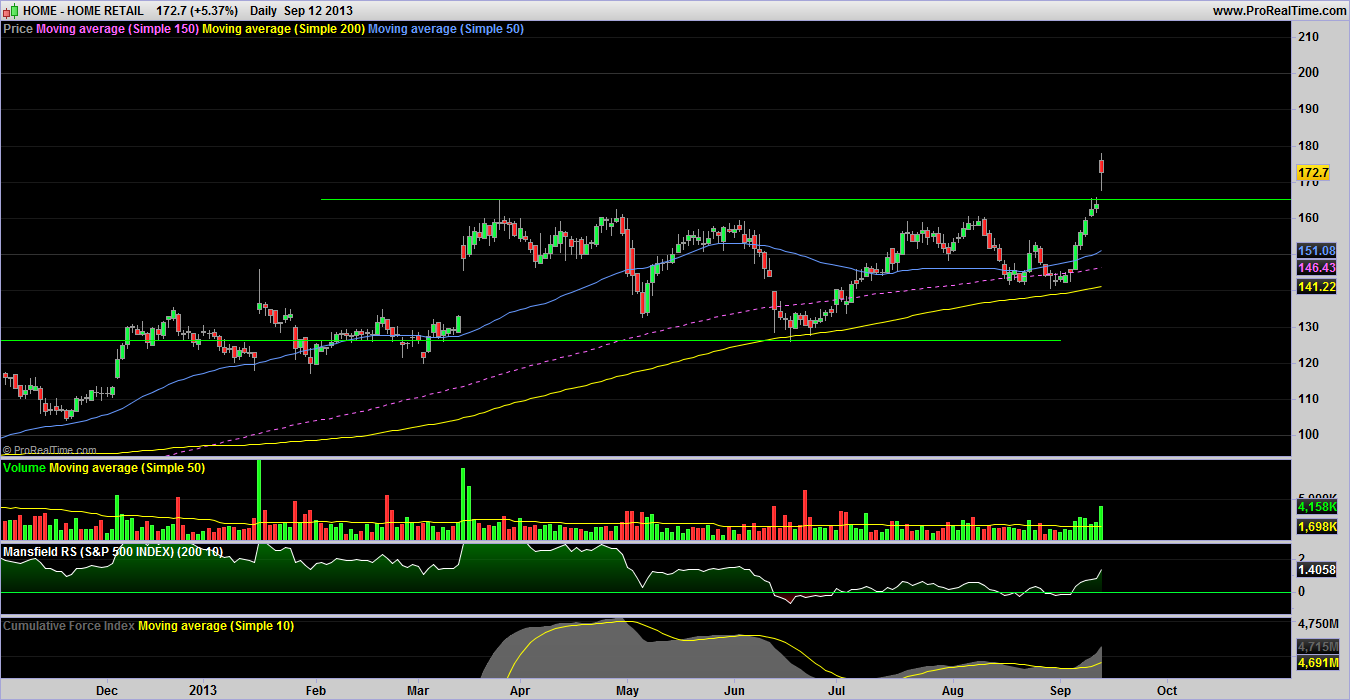 HOME.L broke out on a gap up today on about 2 times average 50 day volume. Need to see a pull back and then execute with a percentage, ATR multiple or other proprietary stop loss positioning method rather than under the last distant swing low. The nearest overhead supply is over 2 years away.