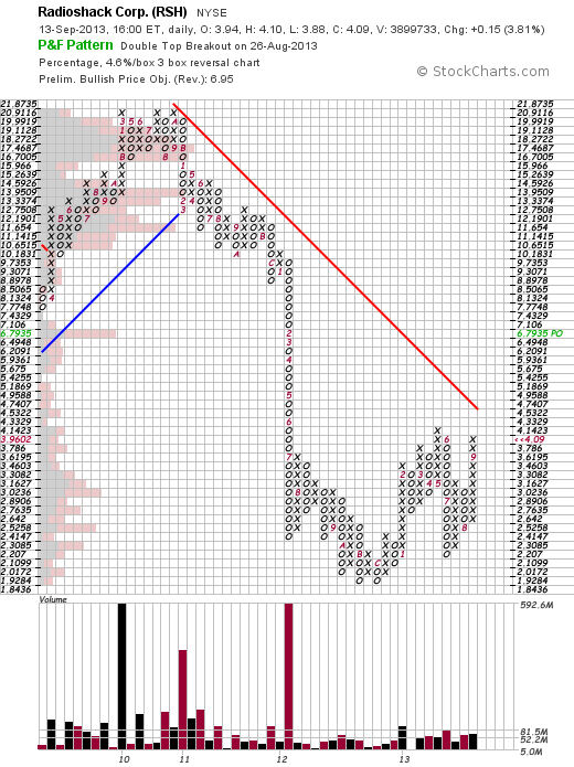 Attached is the weekly chart and a 4.6% box size by 3 reversal P&F chart (I use the 20 day ATR figure to determine the percentage box size to use).