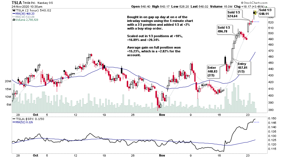(2020-11-23, 08:53 PM)isatrader Wrote: The $TSLA trade continues to work, and I took another 1/3 profits in $TSLA at 524.64 bid (+16.89%).The remaining 1/3 is still open with average price of 451.81 and I moved the stop loss to protect a +10% gain at 496.99, so the worst it can do now, baring a gap down through the stop is a +12.02% average gain, which would be a +2.22% gain for the account. So pleased with the quick trade in this, as only entered on Nov 17.