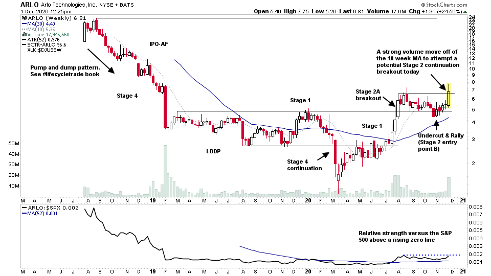 Stock of the day was ARLO, which I last flagged on the 25th November at 5.50. It moved strongly higher today (over 40%) on its largest ever daily volume since its IPO, and briefly broke out of the Stage 2 base, before closing back down in the base at around 31% gain on the day. I'll be watching now how constructive the price action and volume is in the coming days.