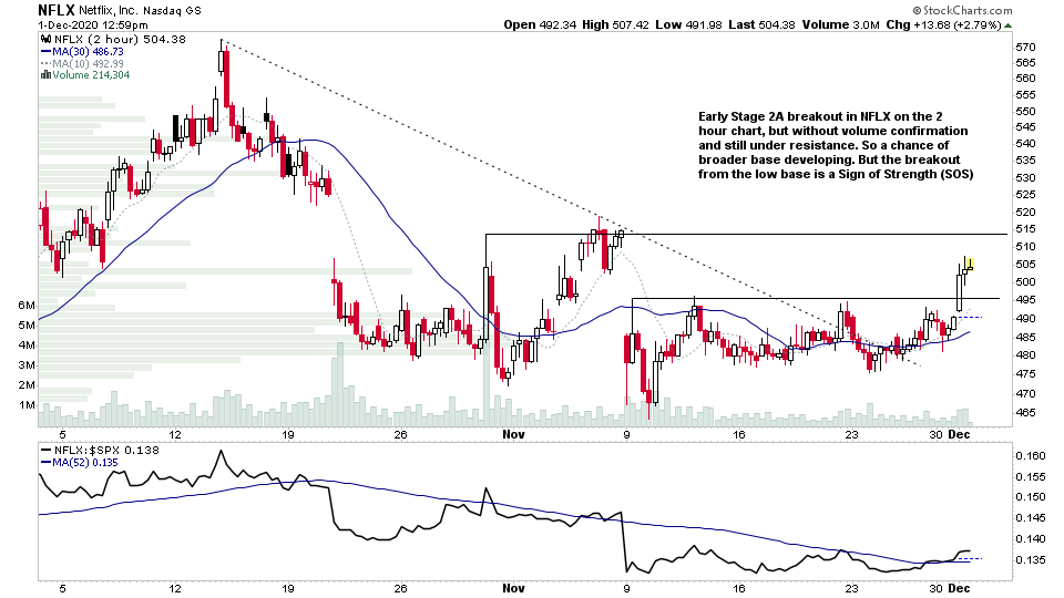 $NFLX Early Stage 2A breakout in NFLX on the 2 hour chart, but without volume confirmation and still under resistance. So a chance of broader base developing. But the breakout from the low base is a Sign of Strength (SOS)