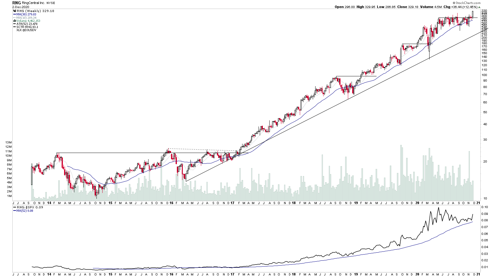 $RNG what a great long term chart to study, and on closer chart note how the breakout occurred in the lower part of the range of the 2 year channel lines.