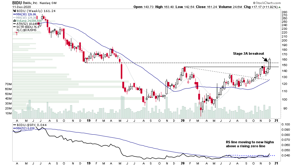 $BIDU made a Stage 2A breakout from a big year and half base this week. Volume only the 1.25x average though. So under 2x requirement, but the size of base projects to well over 100%. So good potential in it & ARK started adding again on 10th & 11th.