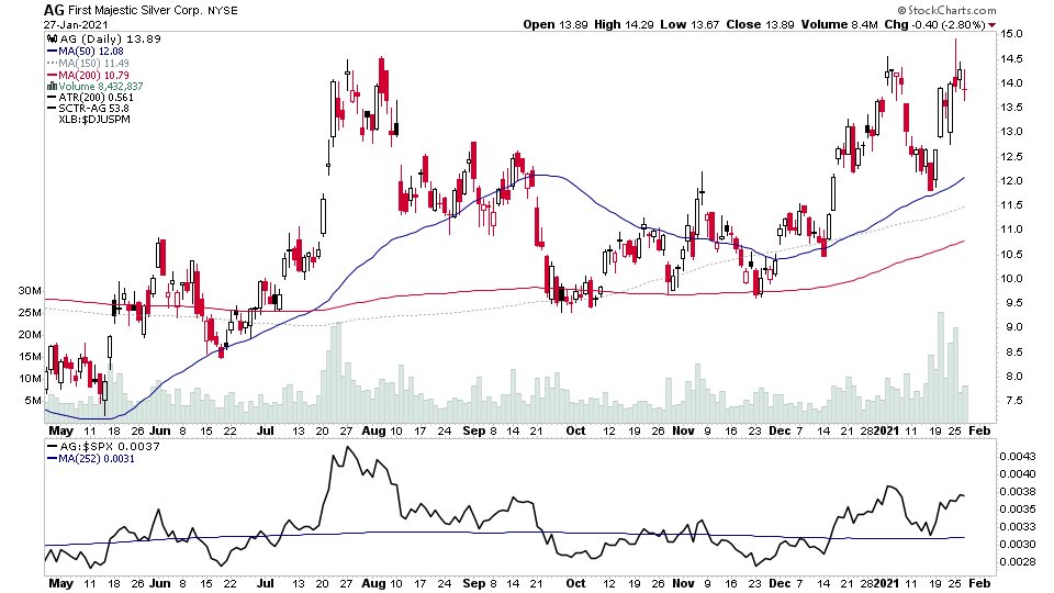 $AG Stage 2 continuation breakout from a 25 week cup with handle pattern on 3.75x the average weekly volume and RS line versus the S&P 500 at new highs.
