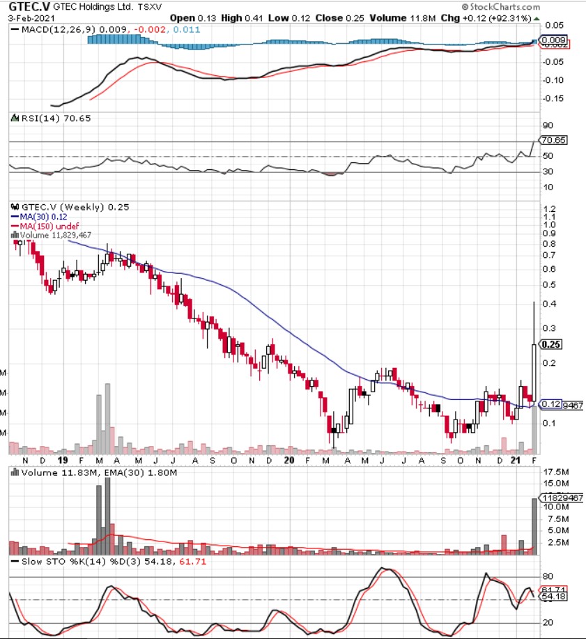 GTEC.V early break-out on the weekly and daily with volume. Rising RSI. Rising sector. Rising main indexes. I think it fits Stan's Stage Analysis criteria for a buy-in (either now or on a pull back). There is also a lot of good sentiment around the stock and the sector more generally.