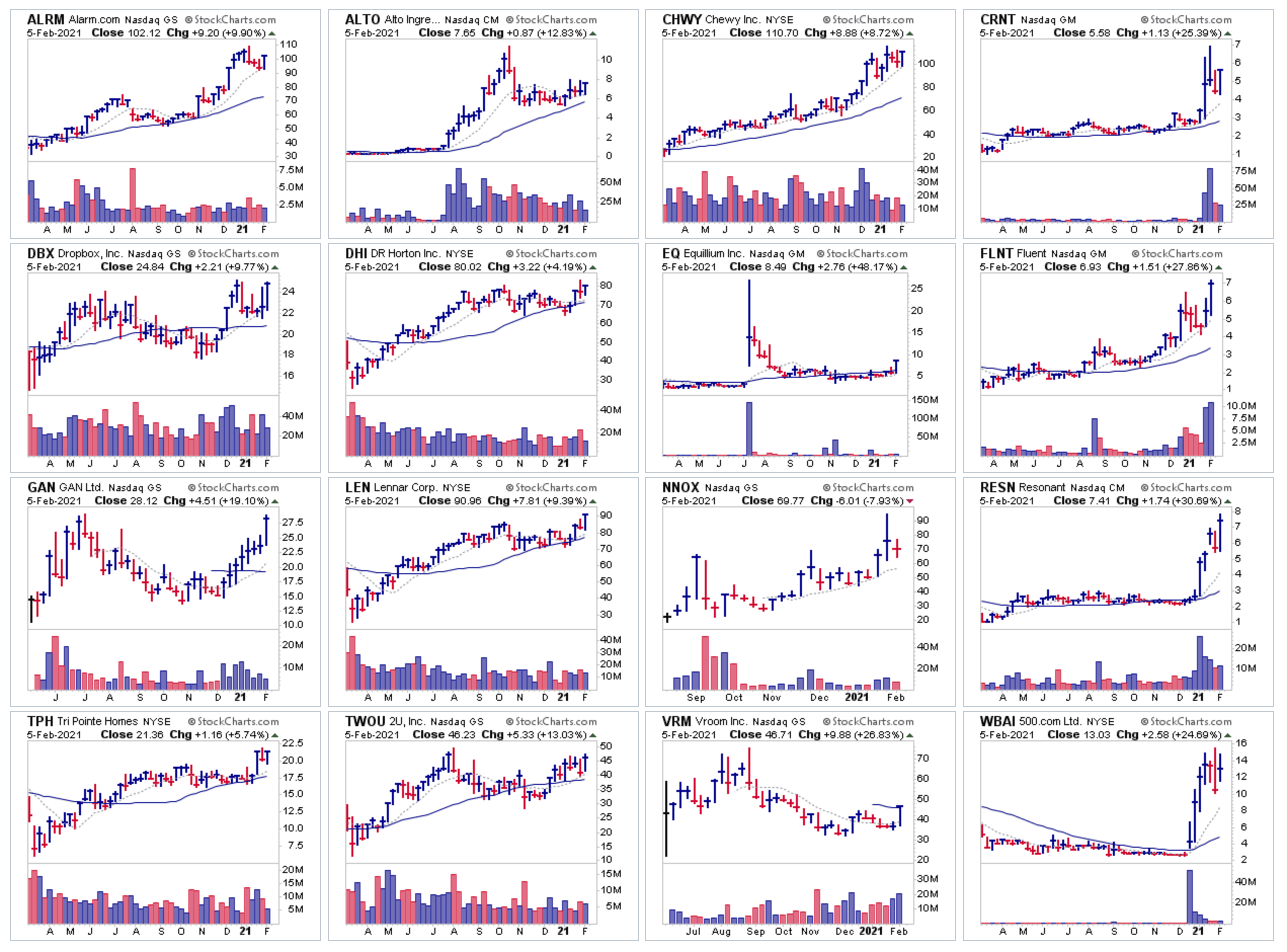 For the watchlist from the weekend scans - ALRM, ALTO, CHWY, CRNT, DBX, DHI, EQ, FLNT, GAN, LEN, NNOX, RESN, TPH, TWOU, VRM, WBAI
