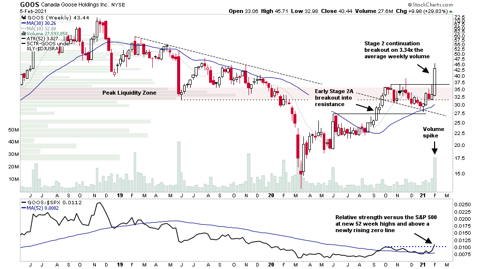 $GOOS initial Stage 2 continuation breakout on 3.34x the average weekly volume with RS versus the S&P 500 at new 52 week highs and a newly rising zero line