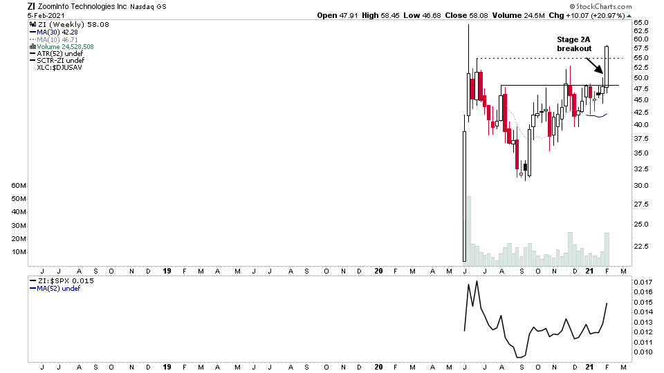 $ZI completes the Stage 2A breakout on more than 2x the 4 week average volume. Annoyed with myself on this one, as I sold it last week on the market weakness and didn't re-enter. Oh well. Will watch if the low risk backup entry point forms for another chance.