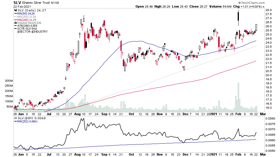 A strong day for the silver miners, as spot gold put in a swing low, and spot silver broke out from its six month Volatility Contraction Pattern (VCP), while growth stocks took a beating with multiple major growth stock leaders from last year closing below their 50 day MA, and near the lows of the day. So a deeper correction in growth stocks looks likely.