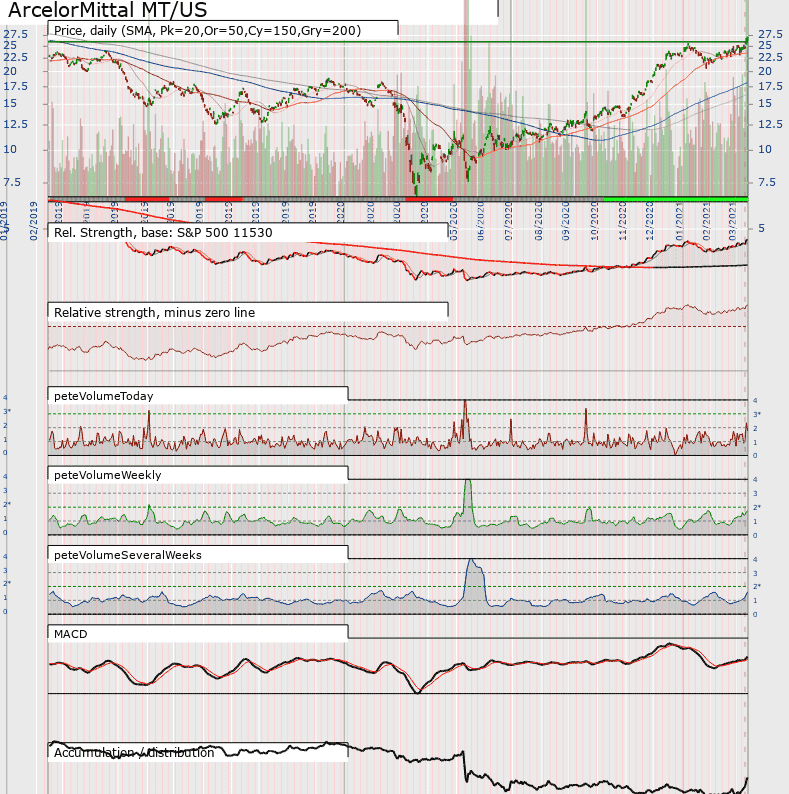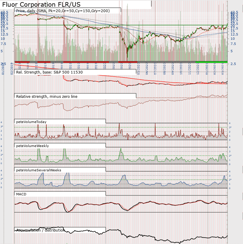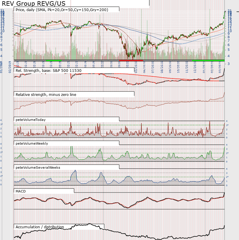 Most of these would have to be bought on a pullback if at all.  A common theme is that they all seem to have relative strength zero lines that have only recently started to slope upwards. However, many are breaking out above upward trend lines, albeit on good volume against old resistance. Are some exhaustion rallys? Or are they steaming on?