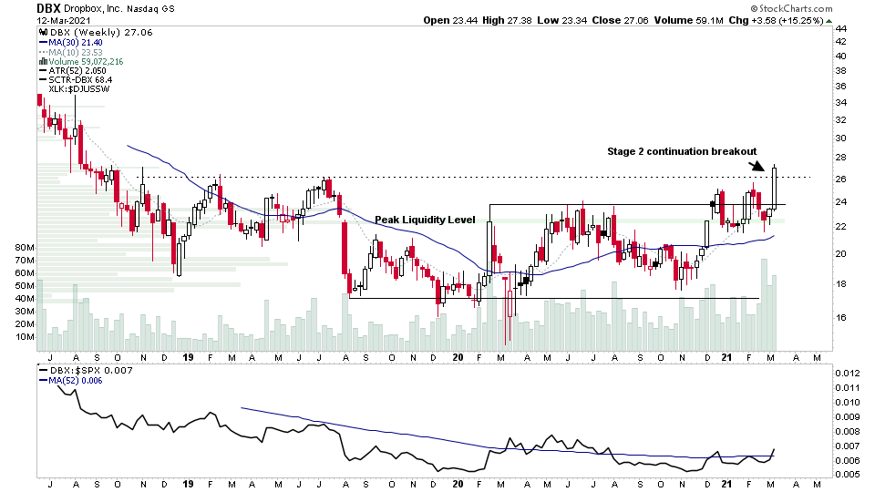 DBX made the initial Stage 2 continuation this week following its Stage 2A breakout back in December and subsequent backup to support at the peak liquidity level which provided the Stage Analysis B entry point.