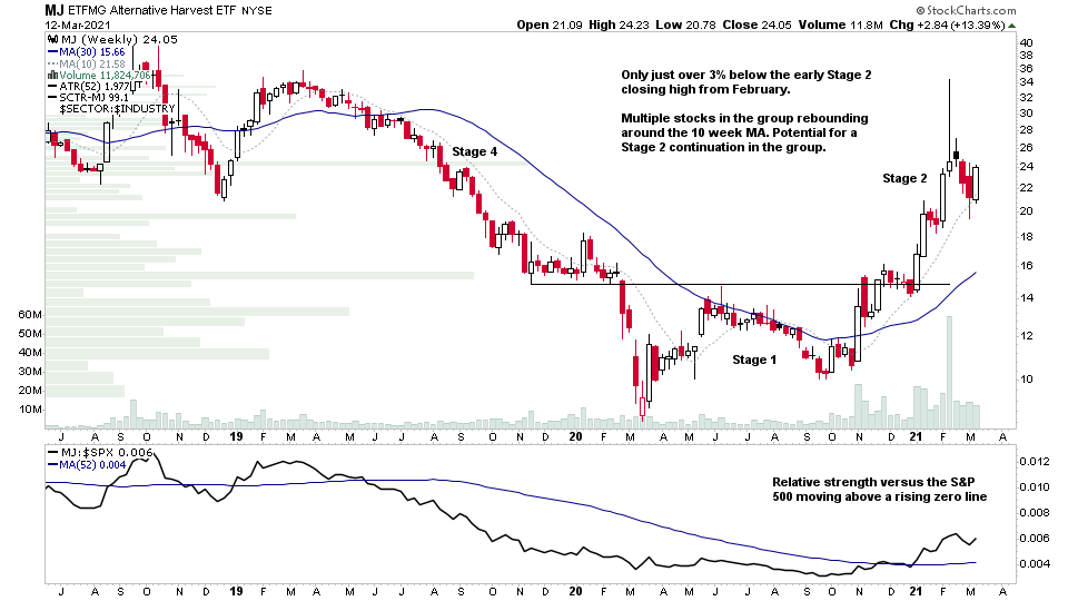 $MJ only just over 3% below the early Stage 2 closing high from February. Multiple stocks in the group rebounding around the 10 week MA. Potential for a Stage 2 continuation in the group.