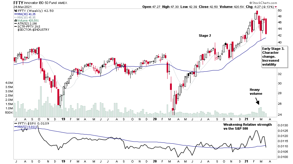 The weekly chart of the FFTY (below) as is a good example of some of the characteristics to look out for in early Stage 3. For example: Buying Climax, Character change, Heavy volume sell off, Increased volatility, RS weakening, Signs of Distribution etc.