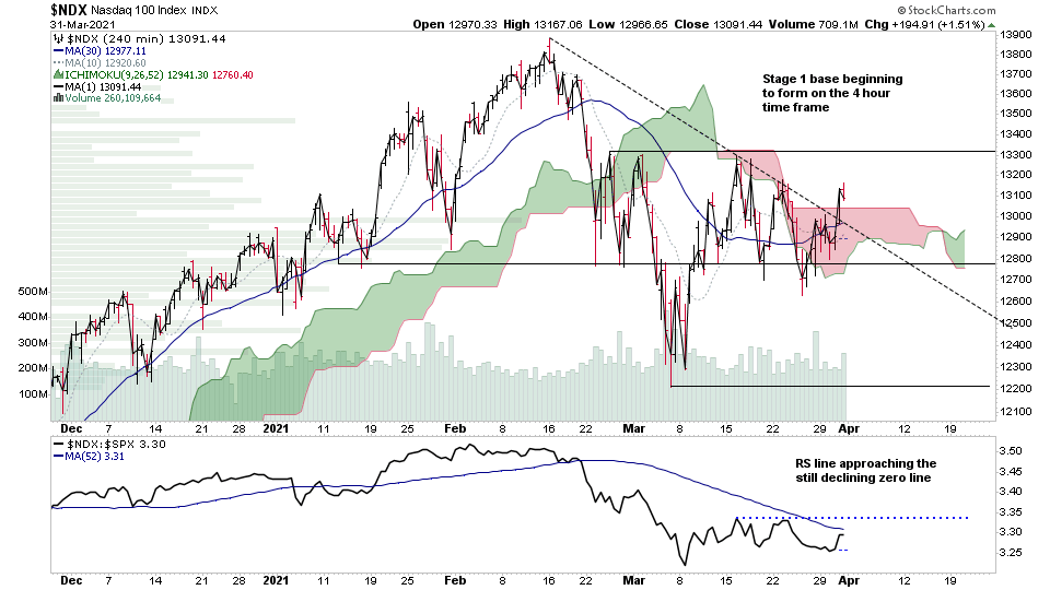 A strong day for the Nasdaq with positive moves across the majority of the Technology stocks especially, which have been the most beaten down of late. The 4 hour chart shows the continued development of the Stage 1 basing pattern that is forming on the lower timeframes, which today cleared some trend line resistance for the first time. So a positive step, but remains within the basing structure.