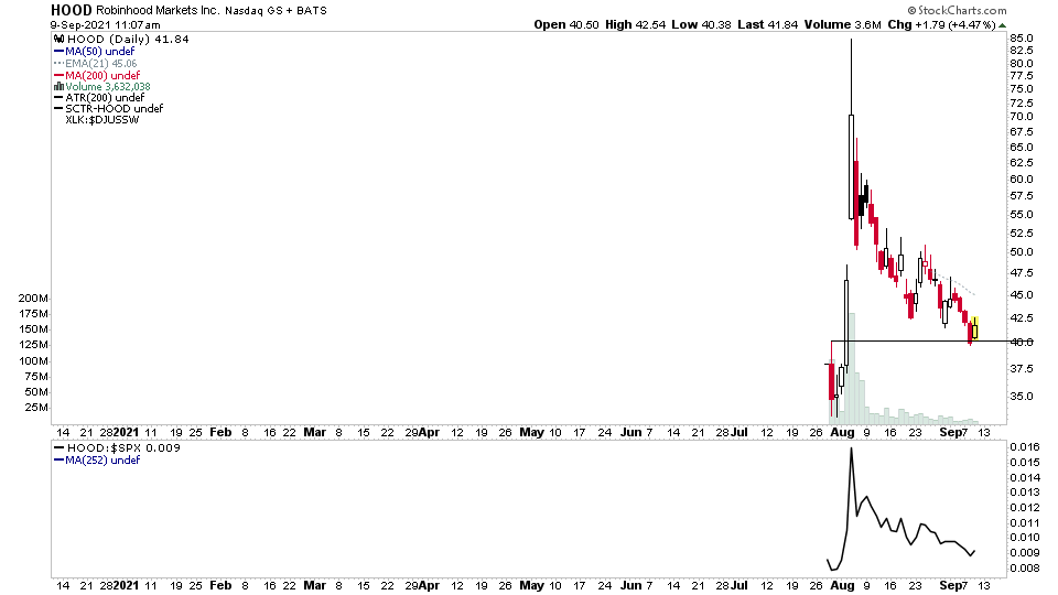 $HOOD has pulled all the way to the IPO day high and 1st significant bar where it's finding support so far. Potential for a squeeze type move. Will keep an eye on it .
