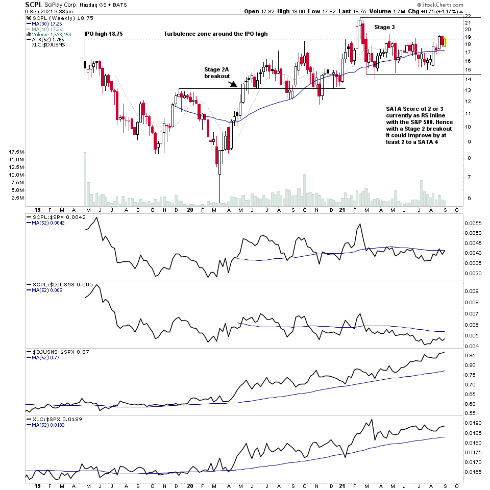 The weekly chart has a SATA Score of 2 or 3 currently, as RS is inline with the S&P 500 this week. Hence with a Stage 2 breakout it could improve by at least 2 ratings to a SATA score of 4. i.e. strong stock and group RS combined with Stage 2.