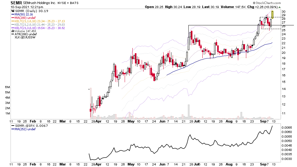 $SEMR from the watchlist. One of todays strongest movers with a continuation breakout to new highs on +69% above average volume for the time of day