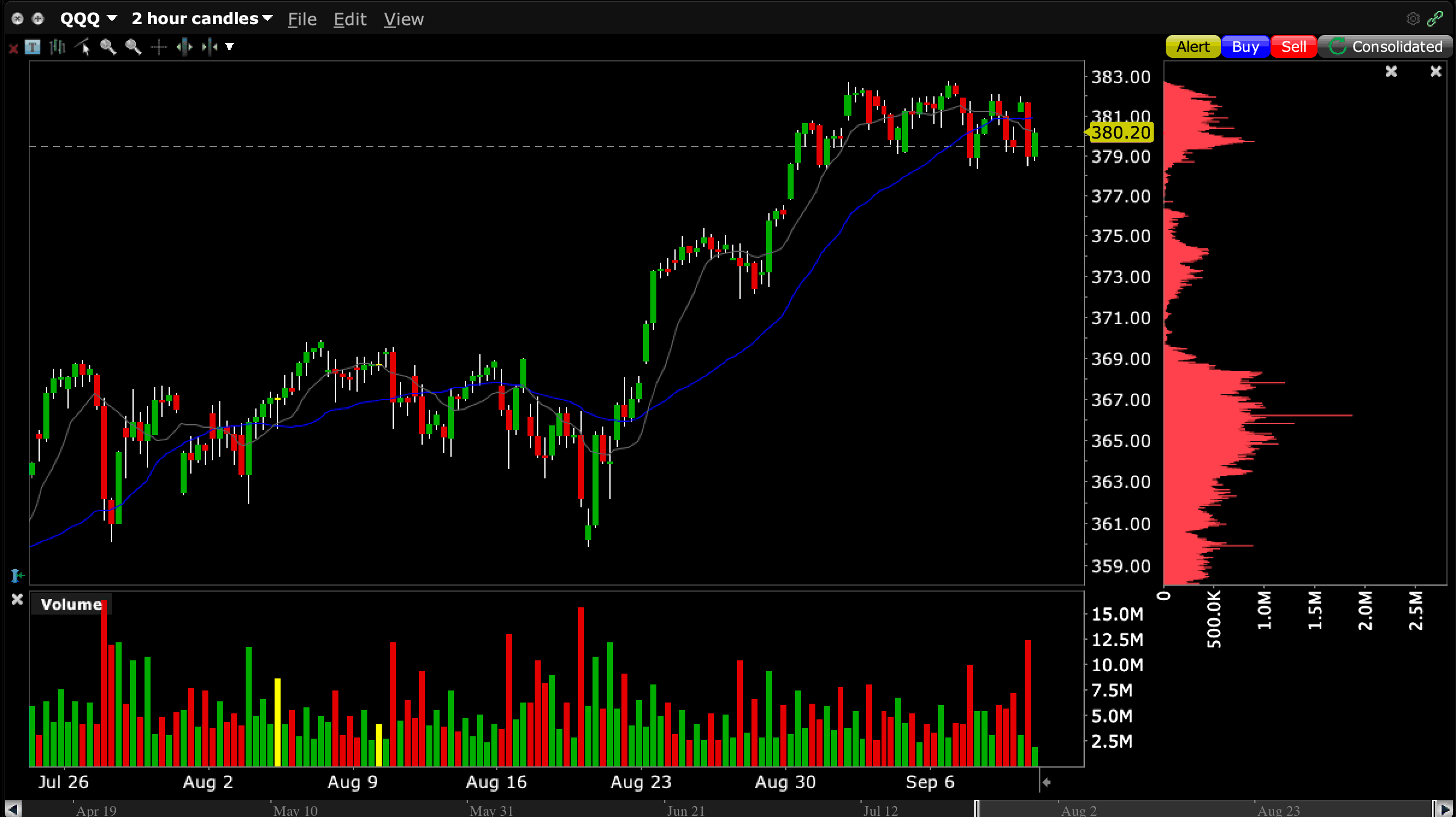 $QQQ there was heavy volume on the 10am-12pm bar, but it failed to breakdown and couldn't even make a lower low (i.e. big effort, but no result) and has now reacted back above the peak liquidity level.