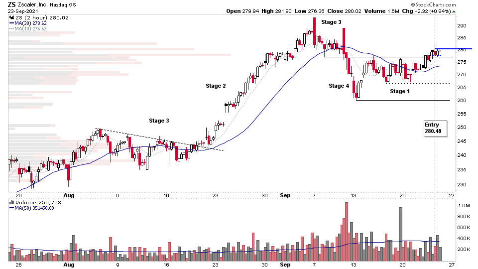 $ZS entry at 280.49. Was an early entry just above the base as no breakout move yet or volume increase. So may turn out to be mistake, but was reasonable size risk to the bottom of the Stage 1 base under 260
