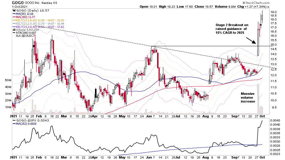 $GOGO from Tuesdays watchlist completed a new Stage 2 breakout this week on exceptionally strong volume (16x weekly average) on news of stronger future earnings growth.