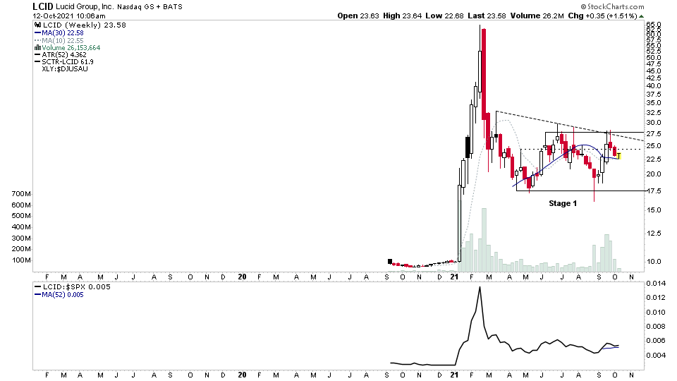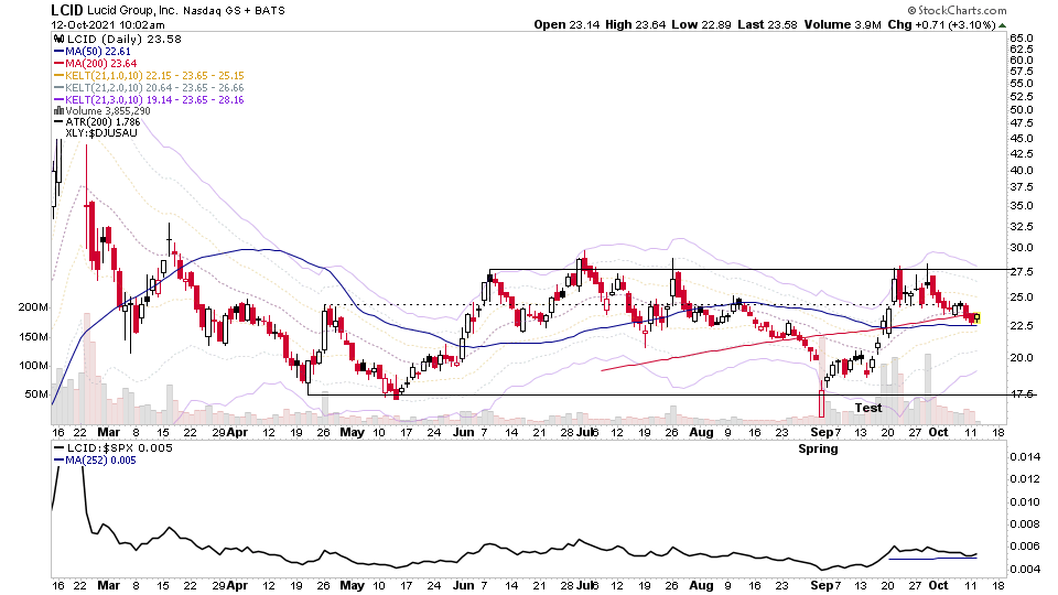 $LCID from the watchlist holding around the key MAs in late Stage 1 in the strengthening automobiles group. Pullback has been on diminishing volume and is less than half the recent swing from the low