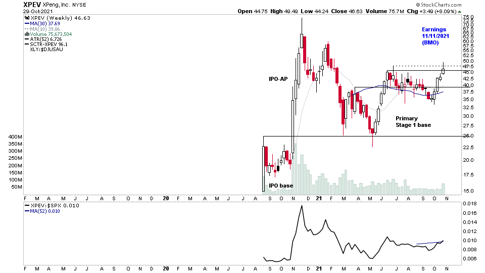 $XPEV is building its primary Stage 1 base since the IPO and is in position for a potential Stage 2A breakout attempt. Earnings are coming up on the 11/11/2021