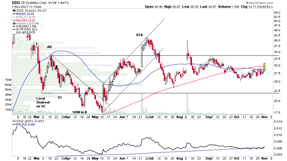 $DDD from the watchlist back through its 200 day MA in its eight month base structure