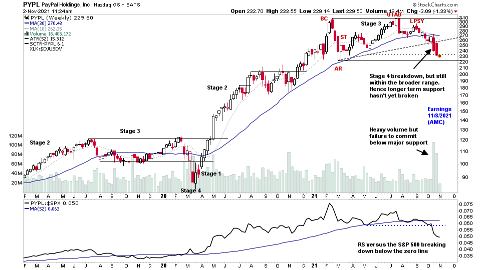 $PYPL off of most peoples radar as it is in Stage 4, but still within the broader range and shortening of the thrust on heavy volume on each recent down week (Effort vs Result)