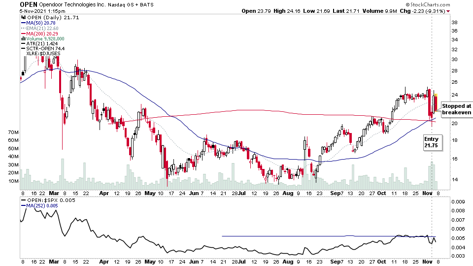 $OPEN stopped at cost. Big reaction move yesterday, but failed to commit above the big down bar and sold off gradually today back towards my entry point. So not acting well.