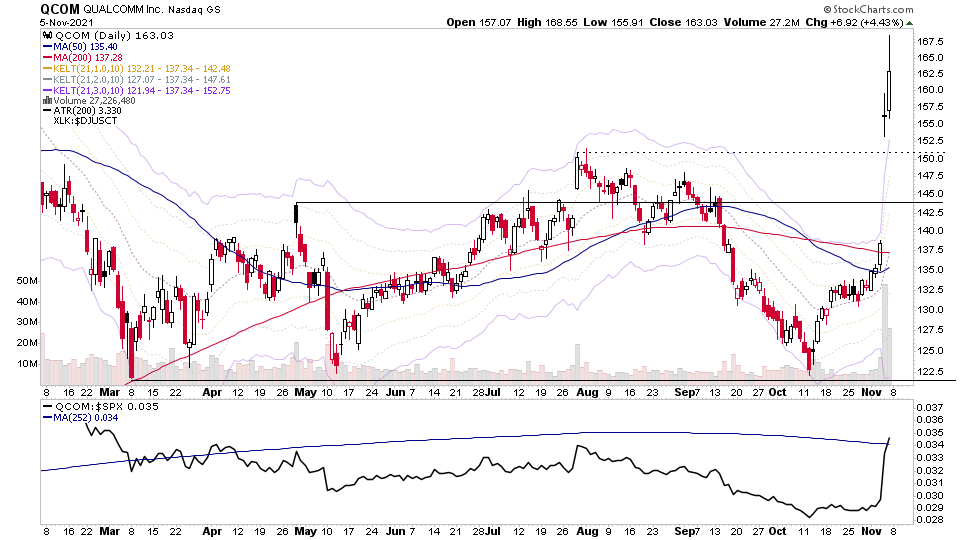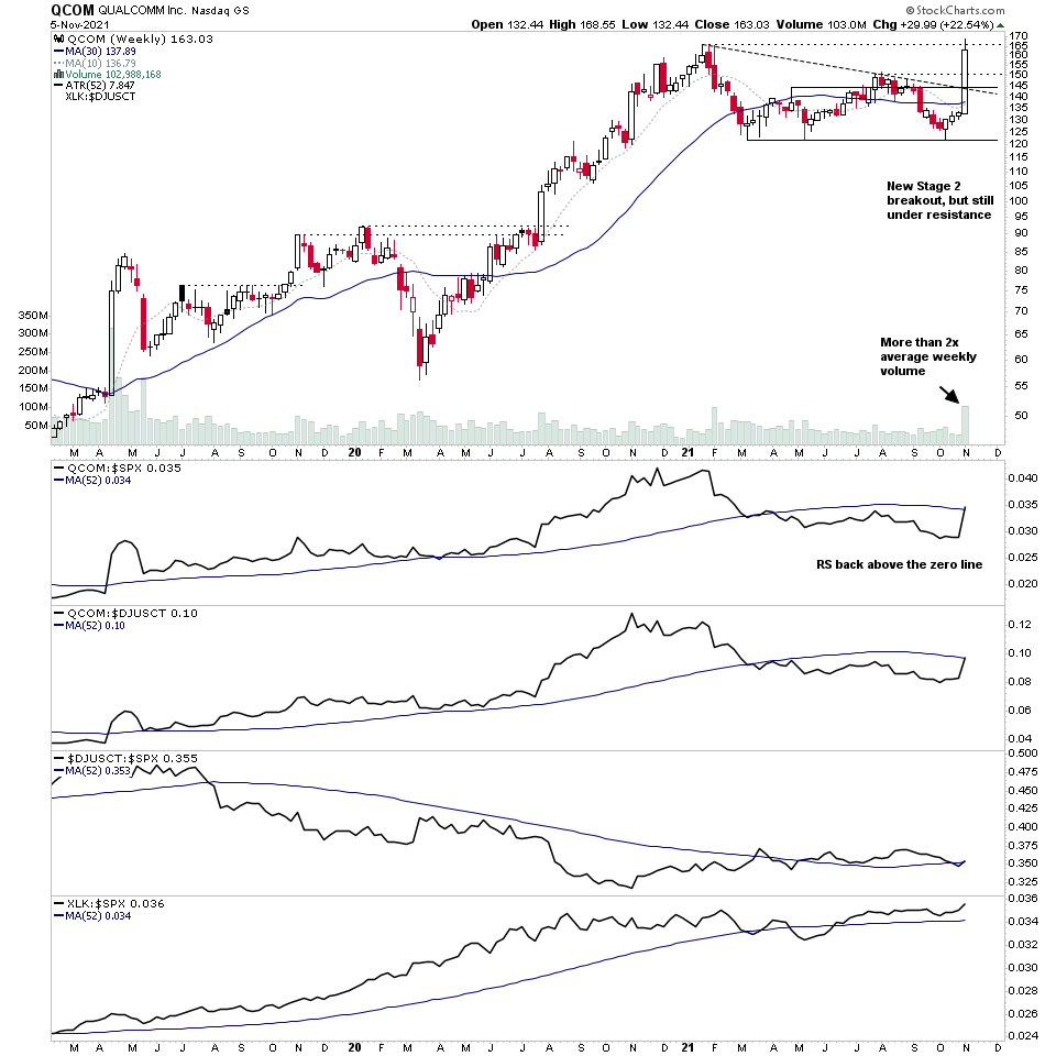 $QCOM new Stage 2 breakout on an earnings gap up on Thursday on massive volume. So a significant bar and closed the week strongly on 3.03x average weekly volume and a SATA score jump from 1 to 5.