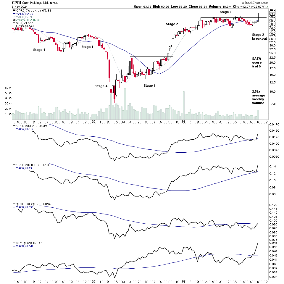 $CPRI Stage 2 breakout on earnings gap on 2.52x average weekly volume and SATA score jumping to a max score of 5.